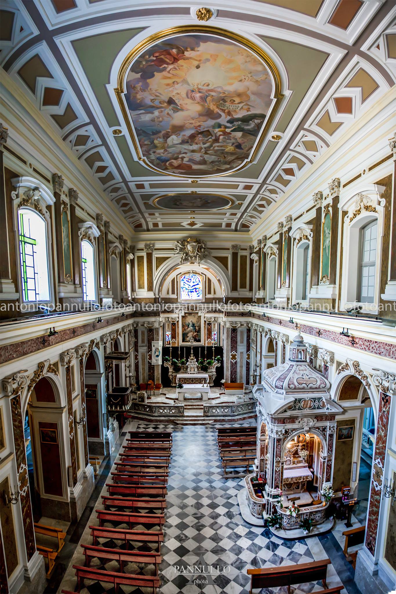 Scheda descrittiva Dietro l'altare maggiore, nella regione absidale, vi è un meraviglioso Coro ligneo, un tempo usato dai monaci per la recita dell'Ufficio Divino. Al centro del coro vi è il grande leggio che un tempo faceva da supporto per i libri Corali. Un meraviglioso dipinto grandeggia sul Coro. Il quadro dell'Assunta è opera di Giacinto Diano. Questi nacque a Pozzuoli nel 1730 e morì a Napoli nel 1803; fu discepolo di Francesco de Mura.
