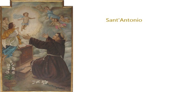 La tela di recente fattura (1957) è opera di F. Antonino Daniele, francescano, (Bracigliano, 24.06.1920 - New York, 19.07.1977). L'autore, accogliendo l'invito del Superiore del tempo, nell'ottica del risanamento della parete esterna impregnata da forte umidità causata dall'acqua piovana, ha fatto dono della sua opera per la ricostruzione dell'altare. Il dipinto rappresenta una delle apparizioni di Gesù Bambino a S. Antonio.